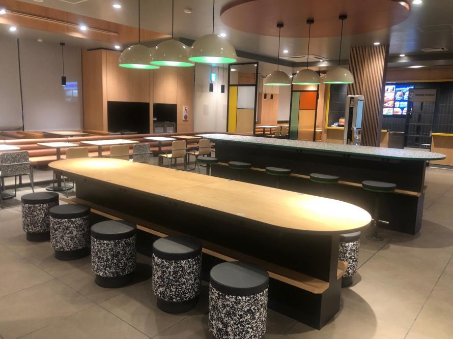 今回のリニューアルでは、お客様ご自身でタッチパネルからスムーズにご注文いただけるセルフオーダーキオスクを4台導入し、混雑時でもより快適にご利用いただける環境を整えております。また、ドライブスルーには2台同時に注文が可能なサイドバイサイド方式の最新のドライブスルー設備を導入し、これまで以上にスピーディーでストレスの少ないサービスを実現いたしました。店内デザインも一新し、広々とした99席の落ち着いた空間では、お食事はもちろん、コーヒーブレイクやお仕事の合間のひとときなど、さまざまなシーンでゆっくりとお過ごしいただけます。お一人様からご家族連れまで、幅広いお客様に快適にご利用いただける店舗を目指しております。
